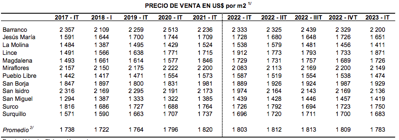 PRECIO DE VENTA EN US$ por m2 DESDE EL IT 2017 AL IT 2023